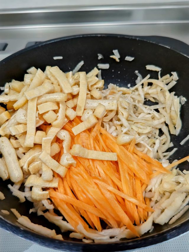 【4】鍋にごま油を入れ強火で加熱し、切り干し大根を加え30秒程度混ぜるように炒める。人参と油揚げを入れて、混ぜ合わせる。