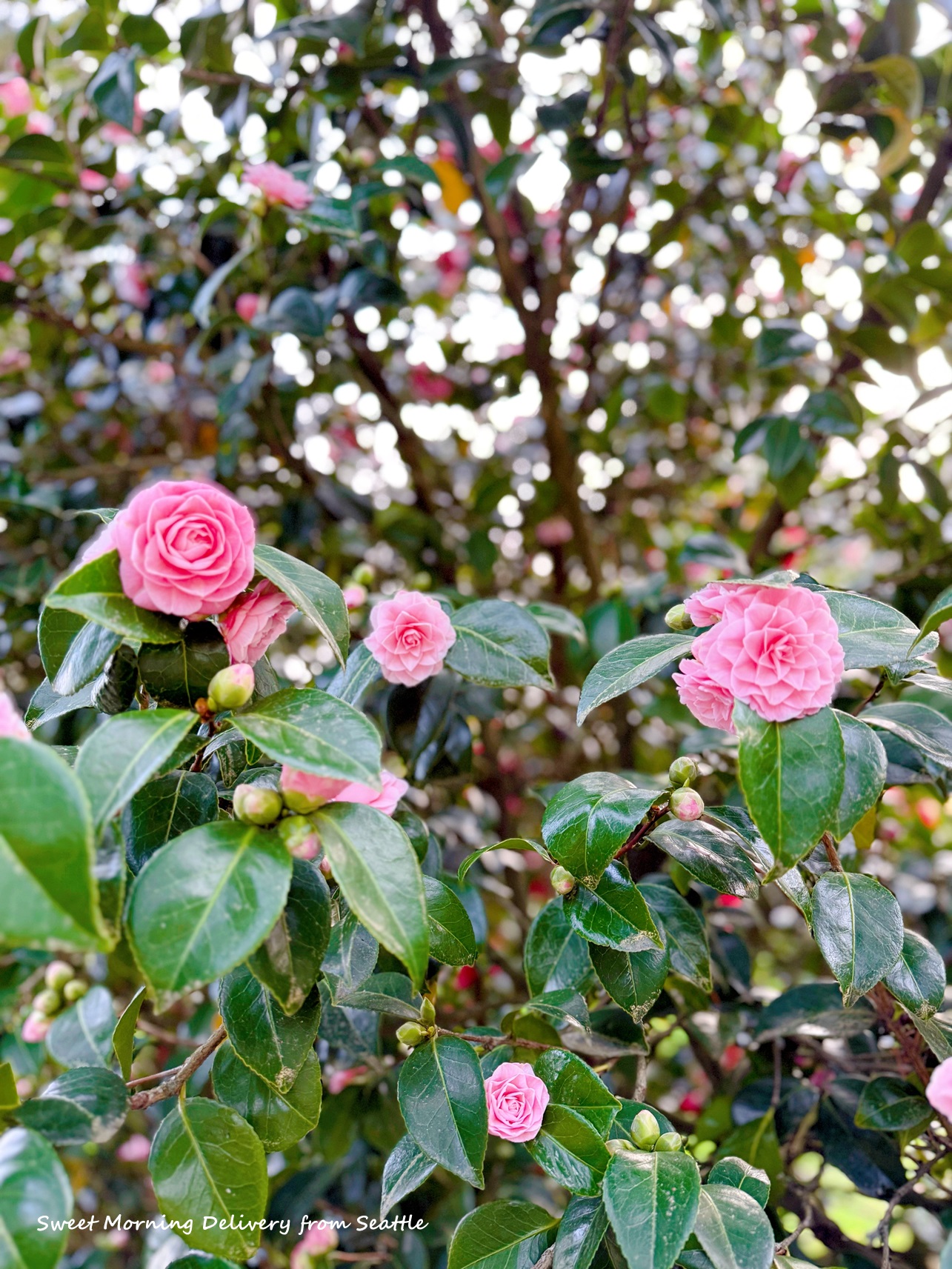 公園の椿(Camelia)の満開。雨が続いたシアトルにもやっと春の気配がしてきました。