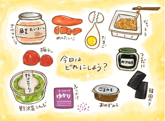 ごはんのお供に、好きなものを数種類用意しておき、その日の気分で食べたいものを選べるようにしています。選ぶときのポイントは、