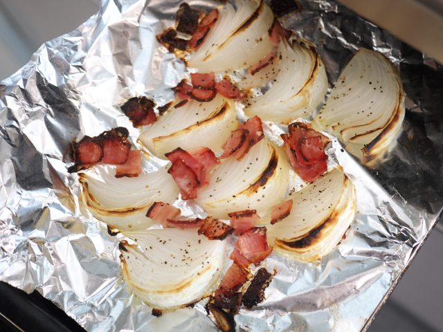 とろ~り甘い!低糖質おかず♪「新玉ねぎとベーコンの和風グリル」