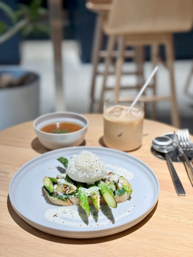 アスパラのオープンサンドは、グリルされた立派なアスパラが3本も。