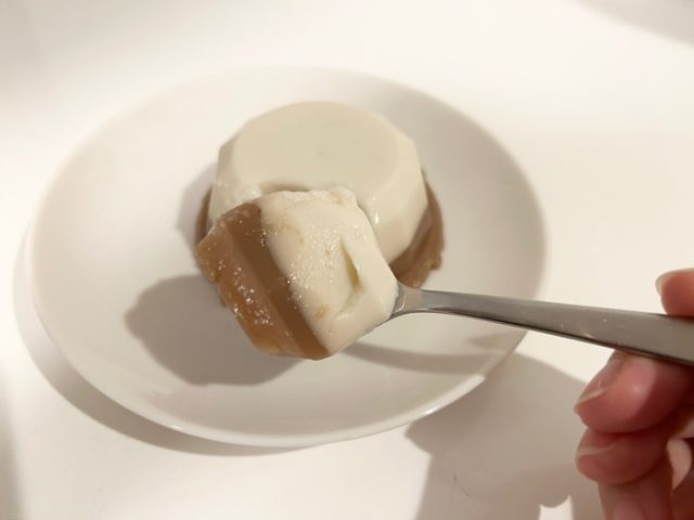 ほんのり胡麻の味が楽しめる層と、甘く懐かしいミルキー味の層の2層になっていて、あのミルキーの味や甘さはしっかり楽しめながらも胡麻どうふならではのあっさりとした甘さもあり、飽きがこない味に。