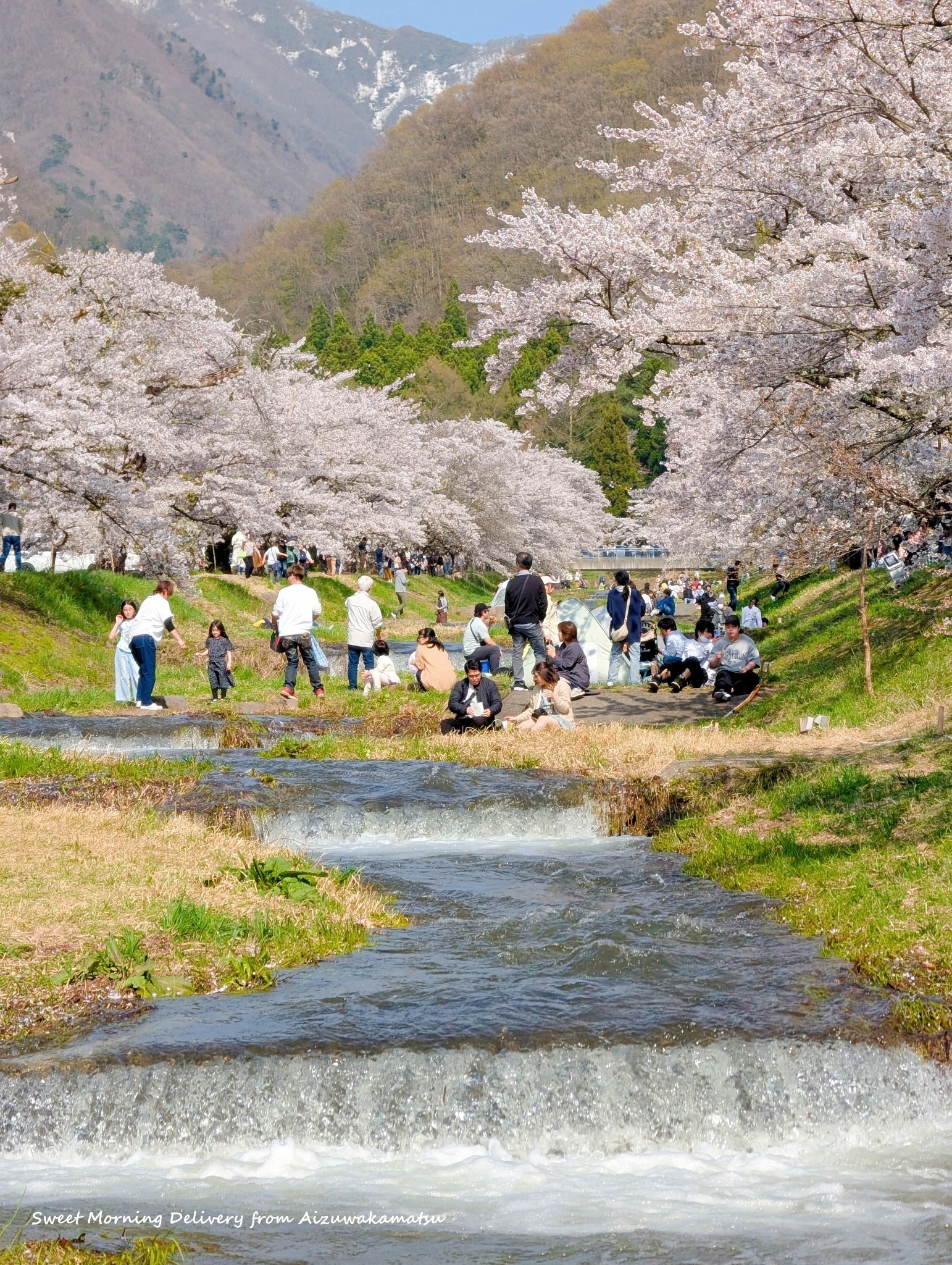 たくさんの人々が川べりで桜を愛でています。