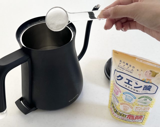 また、電気ケトルの内側についた水垢汚れには、クエン酸が活躍します。満水の水にクエン酸を大さじ一杯入れたあと、お湯を沸かして1時間放置するだけ◎