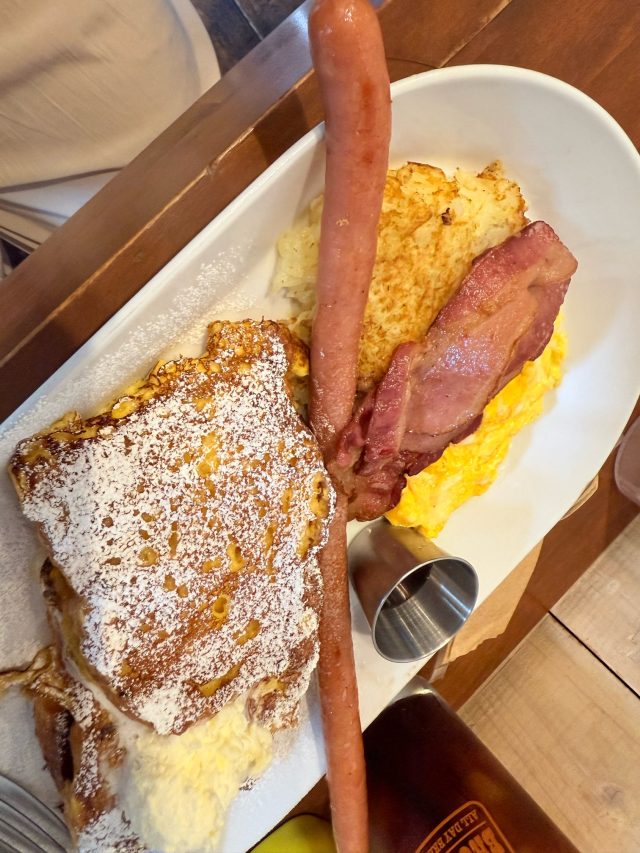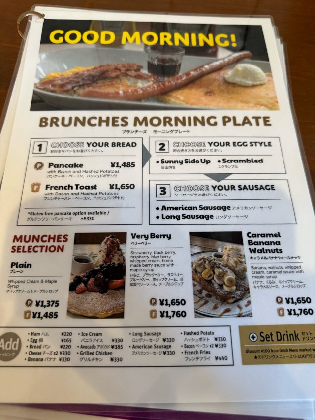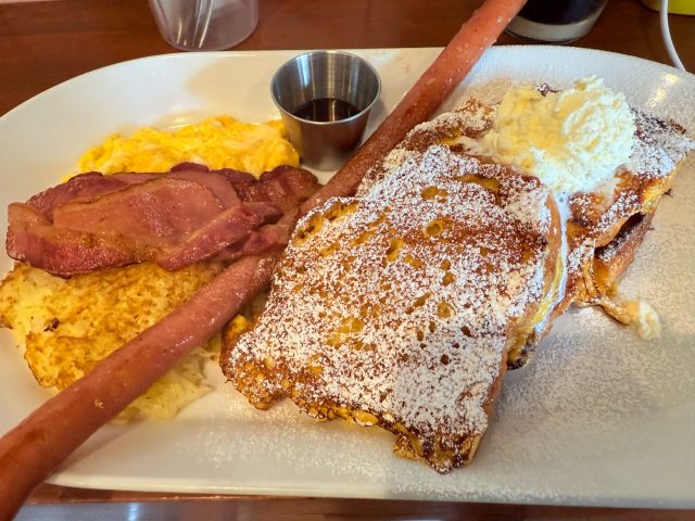 パンケーキもめっちゃ心惹かれますが、フレンチトーストにしてみました。ロングソーセージって??