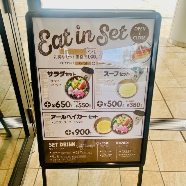 パンをひとつ購入するとお得なセット価格で楽しめる「イートインセット」があります。こちらのセットは、営業時間中いつでも頼むことができます。