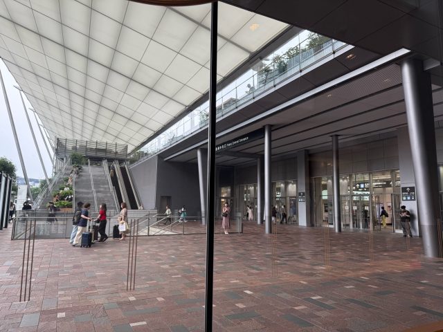 どのくらい目の前かというとカフェから見える景色がこちら。右側が東京駅の八重洲中央口です。新幹線に飛び乗る直前までこちらでのんびりできちゃいます。