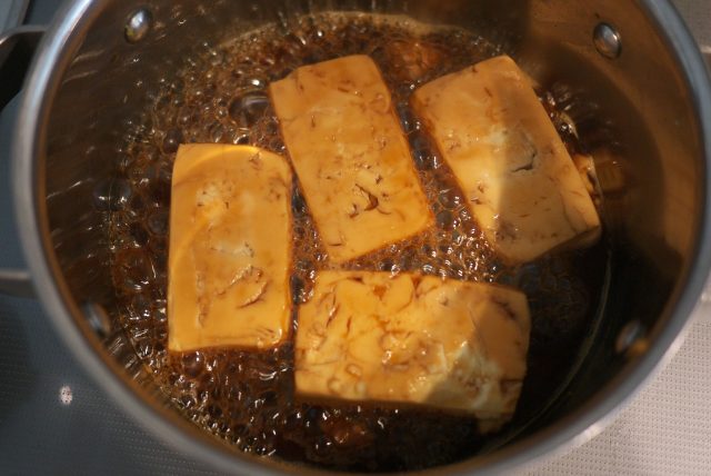 2) しょうゆ・みりん・めんつゆ・水を加え、中火でぐつぐつ煮たたせながら5分煮る。そっと裏返してさらに5分煮る。