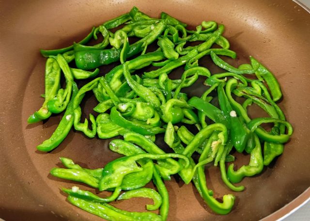 【2】フライパンに米油を入れて中火で熱し、ピーマンに塩をふって2分、しんなりするまで炒める。