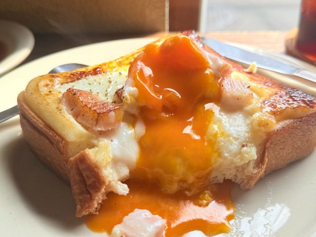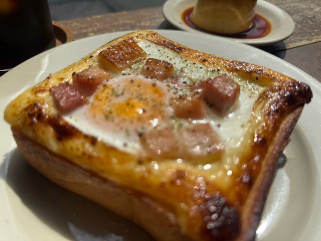 こちらのお店のラピュタパンは卵焼きのみならず。マヨネーズ、半熟卵、ベーコンがのっています。私はトーストを手で待ってパクッといただき。素朴だけどおいしい!