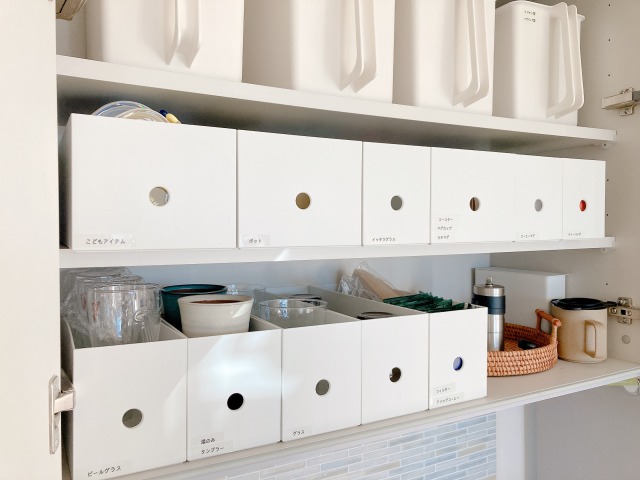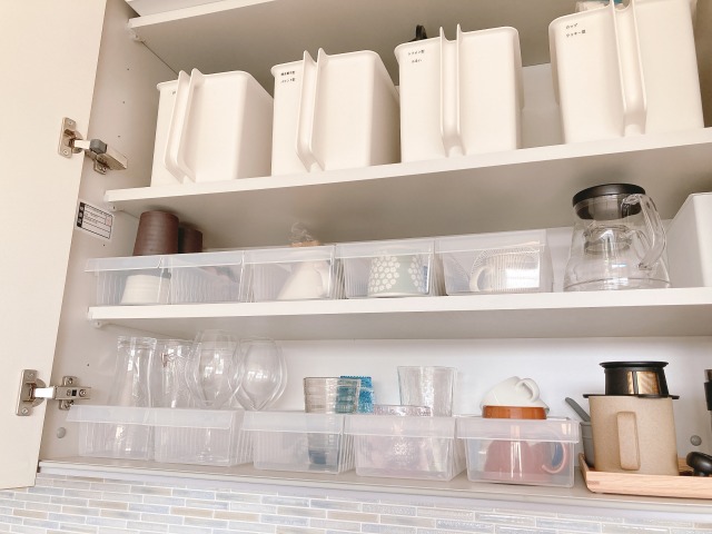 例えばみほさんのお宅では、カップボードのコップ類をファイルボックス収納から半透明のボックスへと変更。