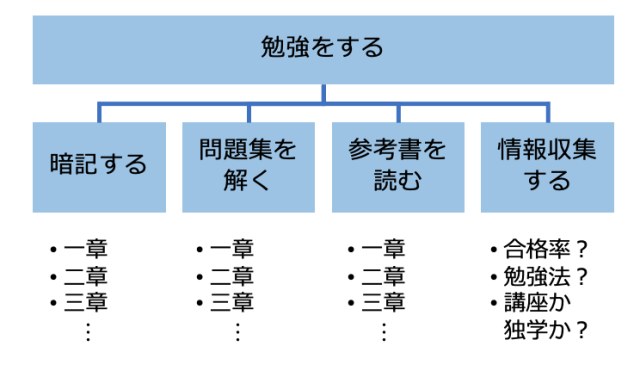 「情報収集する」「参考書を読む」「問題集を解く」「暗記する」の4つの要素があり、そのうち、「参考書を読む」「問題集を解く」「暗記する」は、それぞれ参考書・問題集の章の数だけ、進めるべきタスクが存在します。