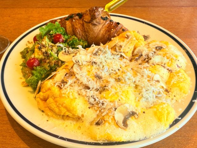 どれにしようか悩んで、江ノ島産しらすとマッシュルームの湘南ゴールドのクリームソースのしらすオムレツにしました。