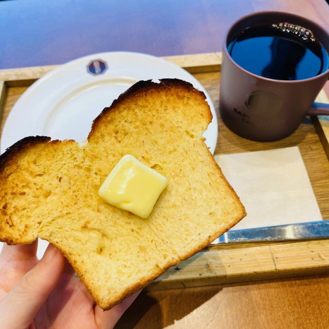 シンプルなバタートーストですが、食パン自体がとてもおいしかったそうです。ふわふわで甘みがあり、口当たりが軽い食感だったんですって。コーヒーは香りがよく爽やかで朝にぴったりだったと言います。