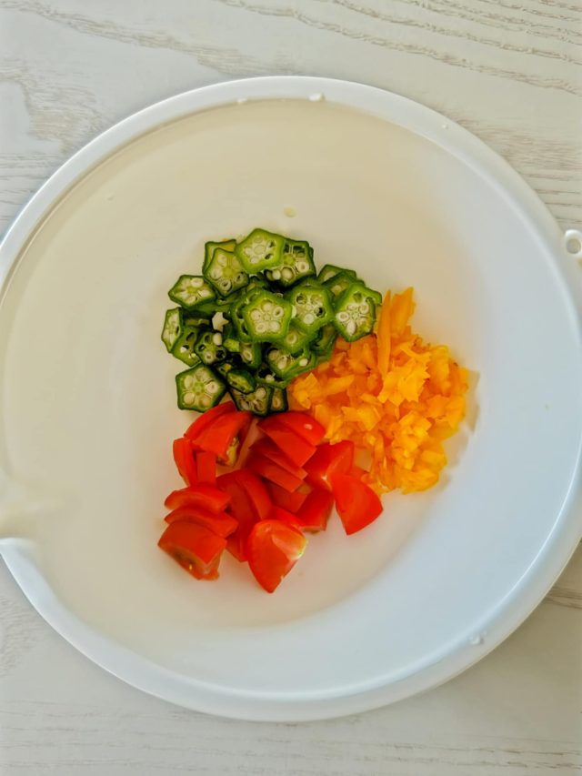 【2】パプリカは粗みじん切り、ミニトマトは角切り、オクラは洗って生のまま薄切りにする。
