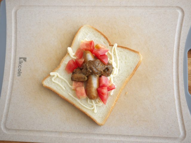 2) 食パンは写真ように斜めにして置く。マヨネーズを線引きし、ウインナーソーセージ、レトルトキーマカレー、周りを囲うようにトマトを乗せる。