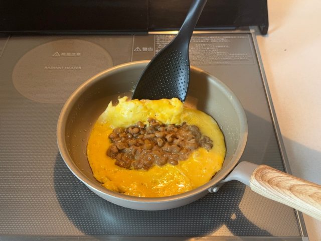 【5】納豆を真ん中に乗せ、卵が固まったら両端を折りたたんでお皿に移したら完成!