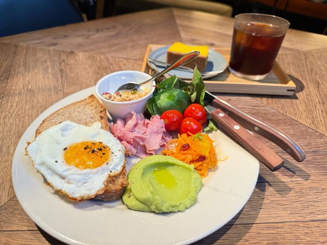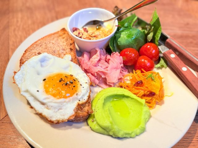 半熟の目玉焼きが乗ったブレッド、アボガドペースト、キャロットラペ、程よい塩加減のハム、お野菜、ナッツたっぷりのヨーグルト。これは朝から幸せな気持ちになる。