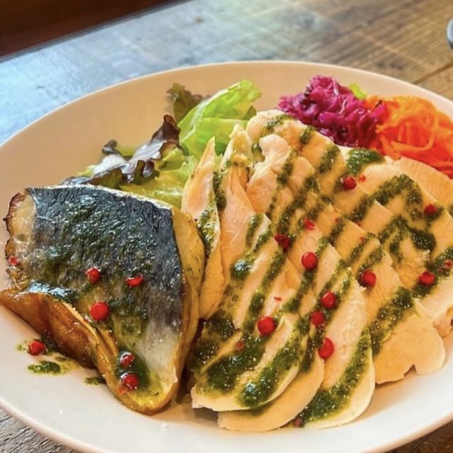サバ焼きの焼き加減が絶妙。むね肉はとってもジューシー。感動のお味です。
