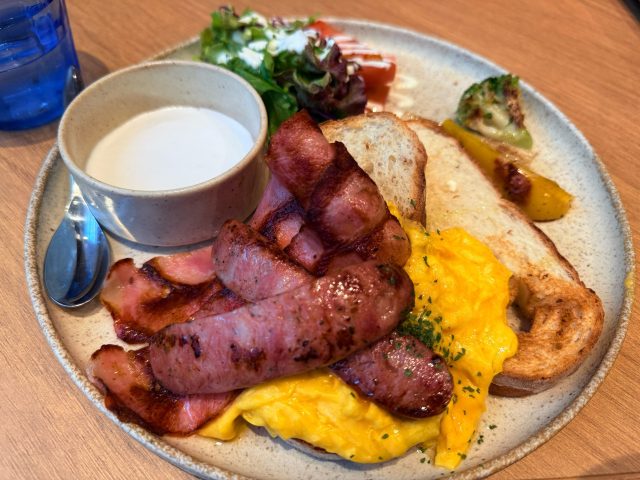 さて朝食をオーダー。モーニングメニューからテーブルにある端末でオーダーしたのはビッグブレッキー。パンに卵焼き、ソーセージやベーコンがのり、お野菜も豊富。