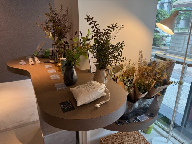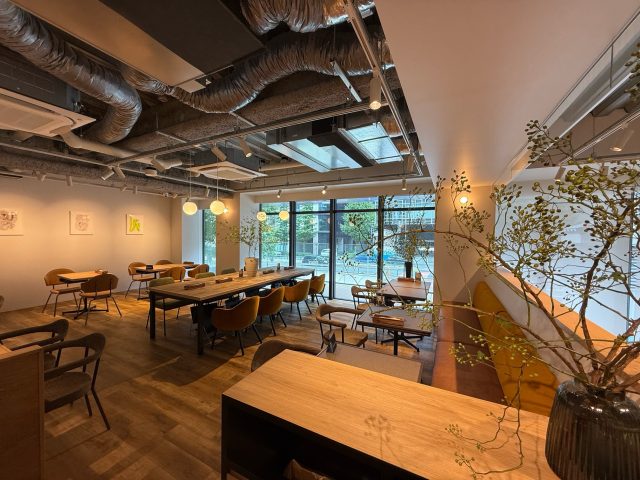 お店のテーマは「四季のうつろいを、 愛おしむカフェ」。四季折々の枝ものを届けるサブスクサービス「枝もの定期便」の運営などを手掛ける会社が手がけているカフェで、随所に心洗われるような緑が飾られています。
