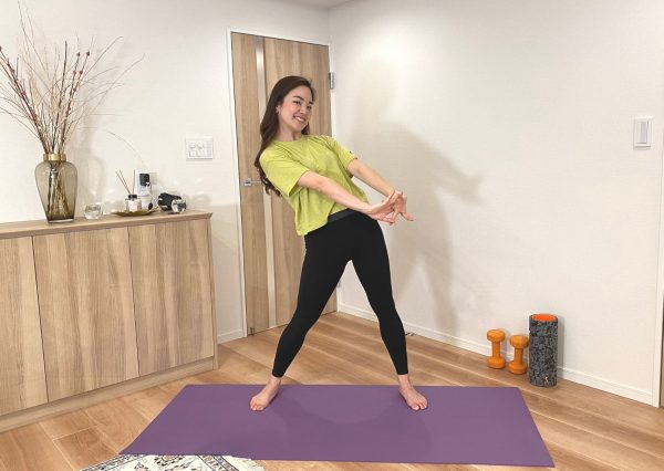 上体を前に倒したとき、手の指先が床につかない場合は下にヨガブロックや厚みのある本、丸めたブランケットなどを下に置いて高さを調整してOK。