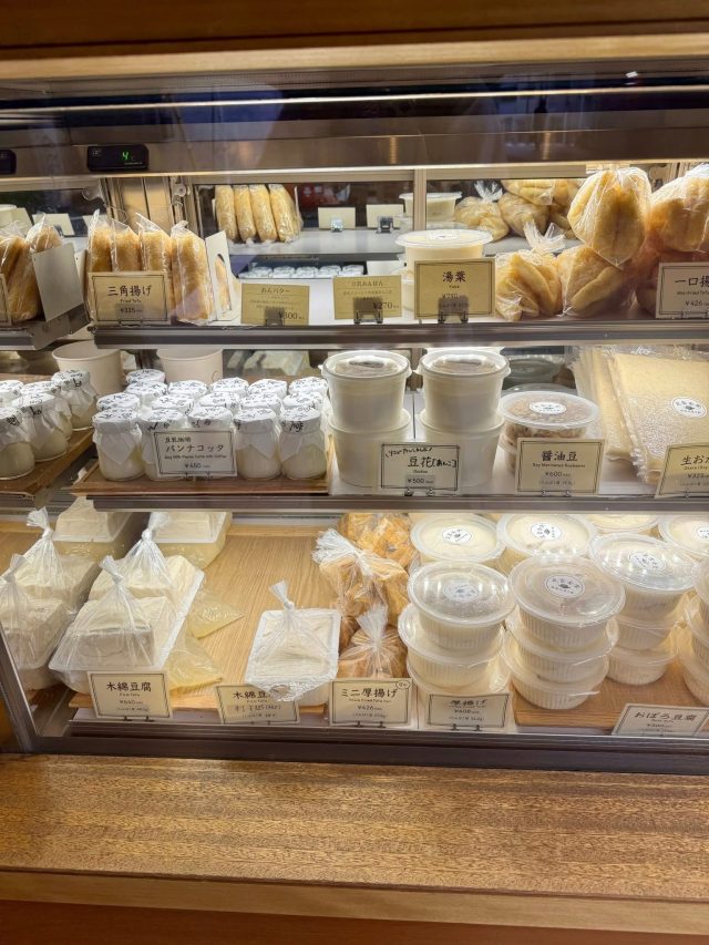 店先のショーケースにはテイクアウト用の豆腐や豆乳、厚揚げ、湯葉、豆花などがたくさん並びます。