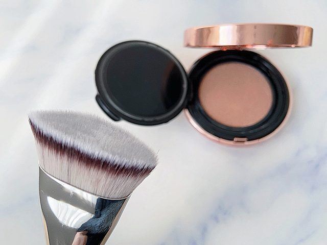 さらに、付属のスポンジではなく平たいファンデーションブラシを使うと、軽やかにすべらせるだけで均一に仕上がり、厚みも出にくくなります。