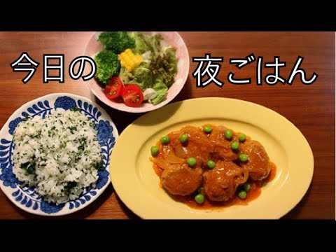 【料理】夜ご飯!煮込みハンバーグ、パセリライス、サラダ