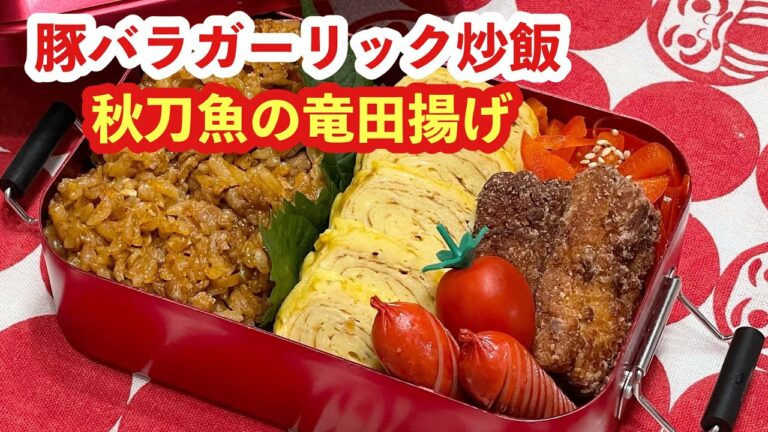 【お弁当】まじで罪作りな旨さ.ᐟ.ᐟ.ᐟ.ᐟ.ᐟ豚バラガーリック炒飯♬秋刀魚の竜田揚げ