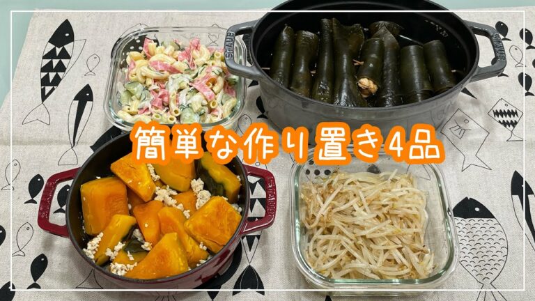 【簡単な作り置き4品】ささみの昆布巻き/マカロニサラダ/南瓜のそぼろ煮/もやしの柚子胡椒ナムル