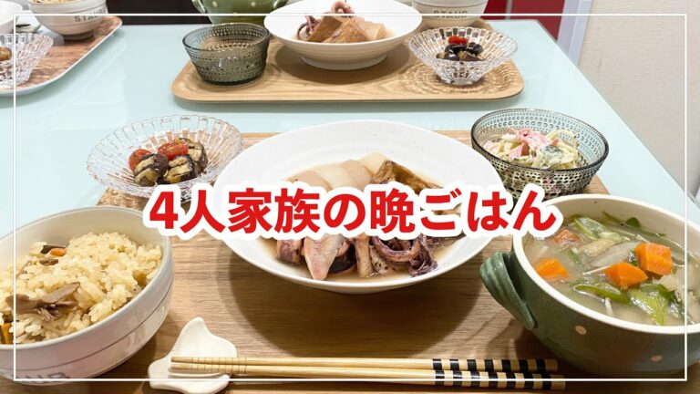 【献立】4人家族の晩ごはん/いかと大根の煮付け/かしわ汁/ミニトマトと茄子のカルパッチョ風/スパサラ