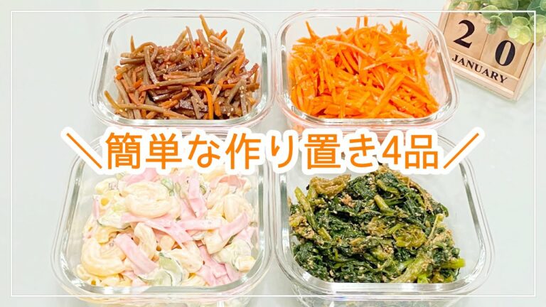 【作り置き】簡単な作り置き4品/人参サラダ/春菊の辛子胡麻和え/マカロニサラダ/お出汁が香きんぴらごぼう