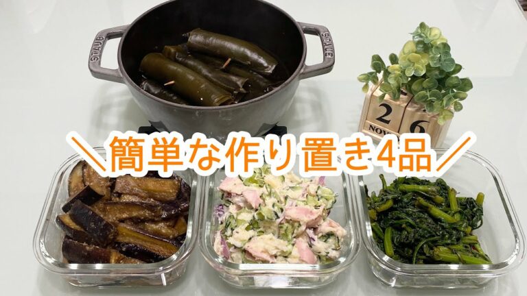 【作り置き】簡単な作り置き4品/春菊の辛子醤油和え/茄子の胡麻酢炒め/ささみの昆布巻き/ポテトサラダ